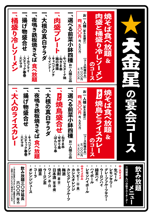 大金星では宴会コースのご予約を承り中です。